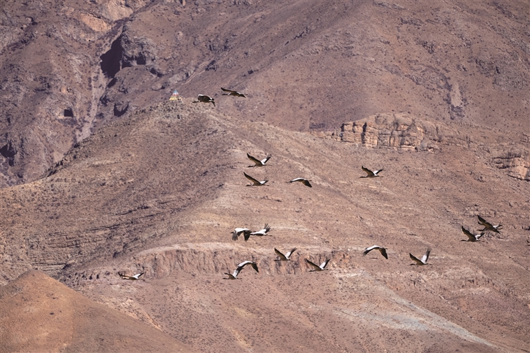 每年10月至次年4月,黑颈鹤迁徙至拉萨越冬。林周县因其独特的湿地与耕地资源,成为黑颈鹤的核心栖息地。每年11月底至12月,黑颈鹤陆续集结于此。近三年,越冬的黑颈鹤数量稳定在1600至2300只,占拉萨越冬黑颈鹤总数的近六成。