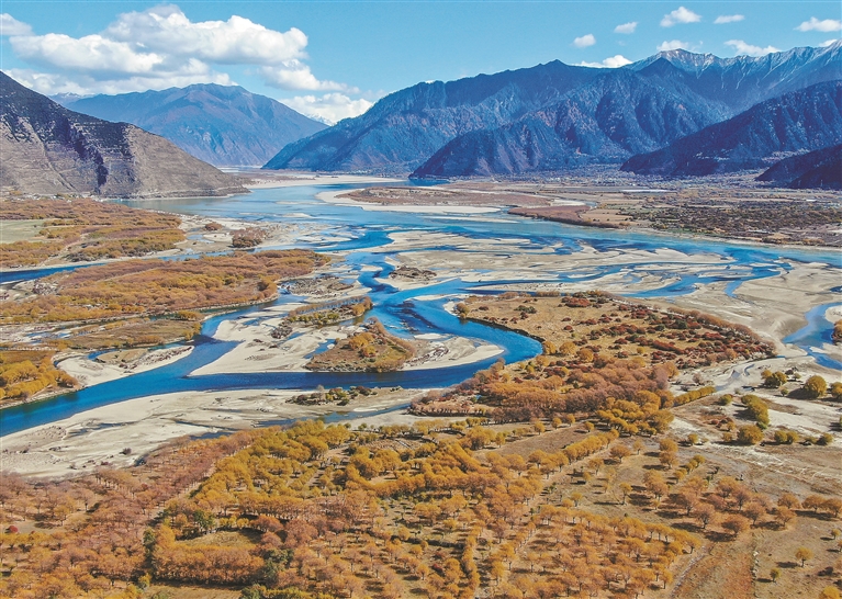 12月的尼洋河畔,染了霜的柳树虬枝苍劲,串连成行,迎着初冬的河风,倔强地不肯被冬日气息浸染,摇曳出满树金黄。那泛着蓝光的河水,如游动的缎带,绕着河洲和村庄,纵横成网,流向宽阔的雅鲁藏布江。