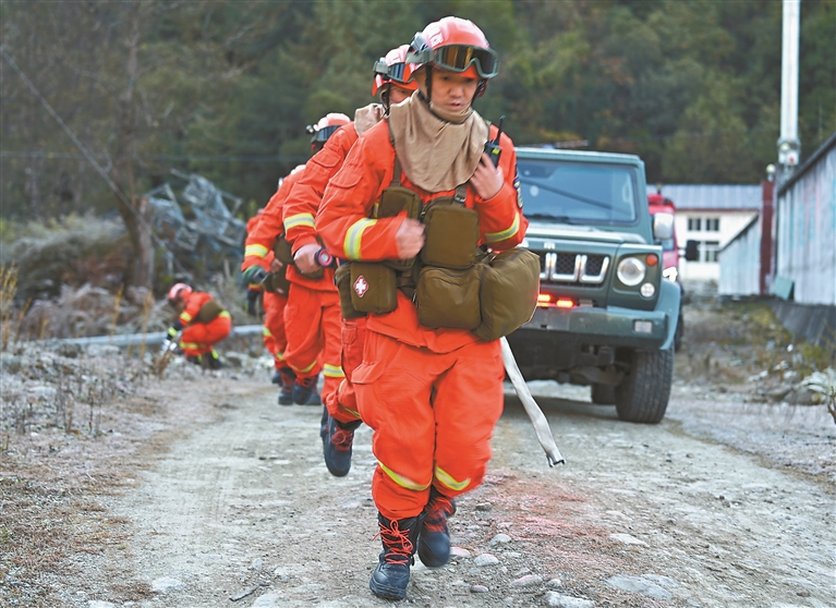 波密县森林消防中队驻墨脱分队集结前往演练现场。记者 王敏 通讯员 郎玲 摄