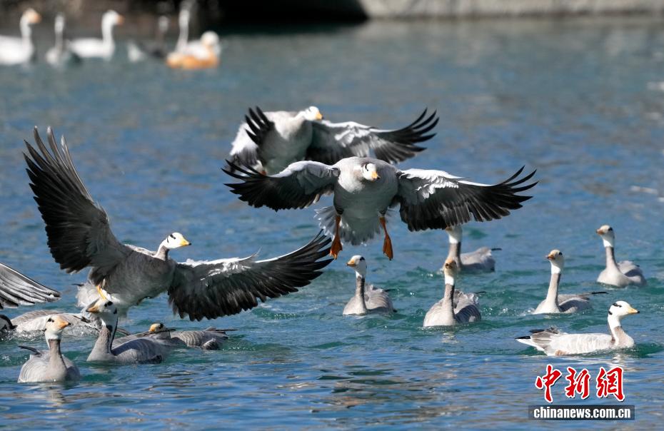 12月17日,西藏拉萨市区宗角禄康公园,大批斑头雁“集结”越冬。成群结队的斑头雁等越冬候鸟吸引市民游客驻足观赏、拍照留念。图为宗角禄康公园越冬的斑头雁。