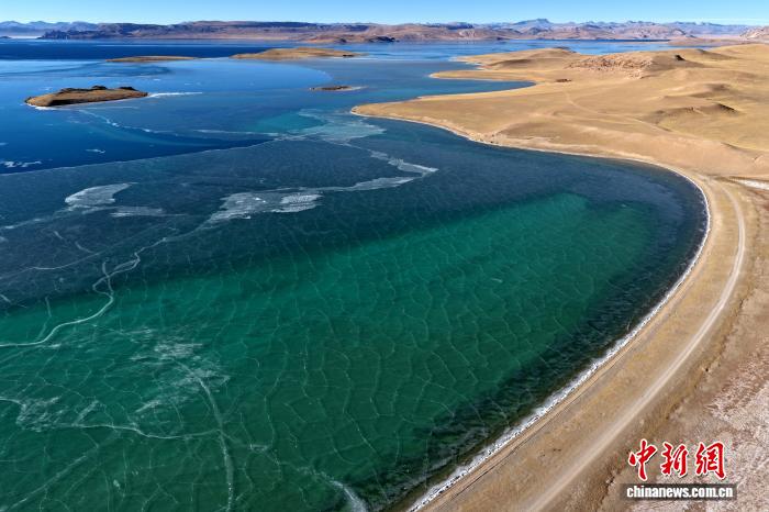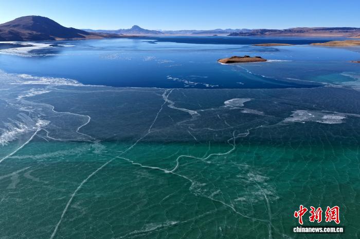 12月20日,航拍错鄂湖。错鄂湖,位于西藏那曲市申扎县境内,是色林错的卫星湖。冬日错鄂湖在阳光照耀下,湖泊呈现蓝、绿等多种颜色,景色迷人。图为错鄂湖景色。(无人机照片)中新社记者 李林 摄