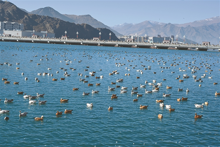 近年来,拉萨市坚定不移走生态优先、绿色发展之路,积极践行“水润城、绿满城”发展理念,高标准推进拉萨河城区段人工湖生态治理工程。据了解,该工程有效改善了城市水生态环境,提升了市民生活品质,更构建了优质生态空间,吸引大批候鸟驻留越冬。如今,这片水域既是市民休闲游憩的好去处,也是候鸟越冬的天堂,刻画了人与自然和谐共生的美好画卷。