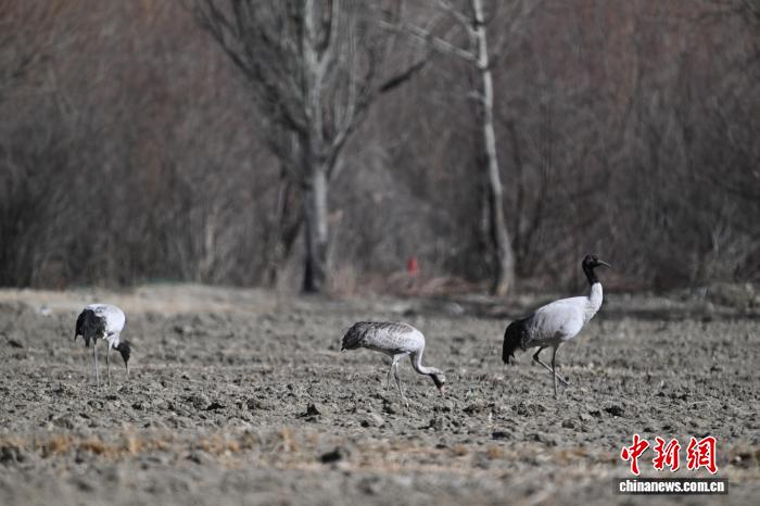 图为山南市贡嘎县境内,在田间觅食的黑颈鹤一家。中新社记者 贡嘎来松 摄