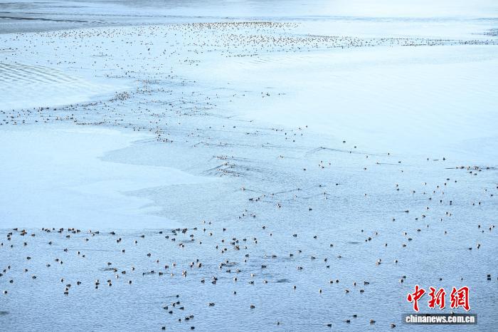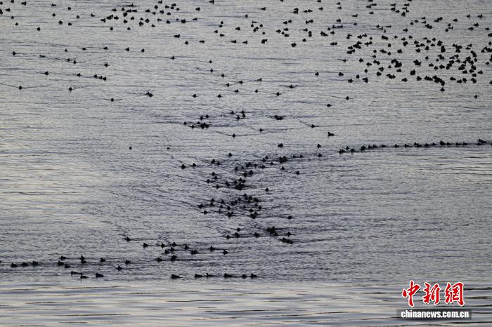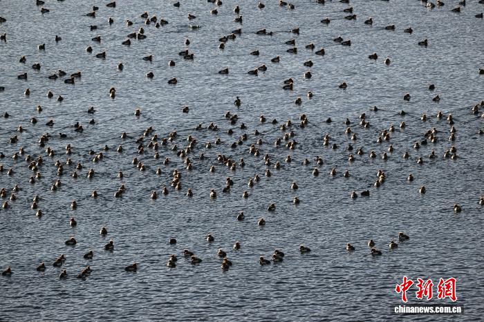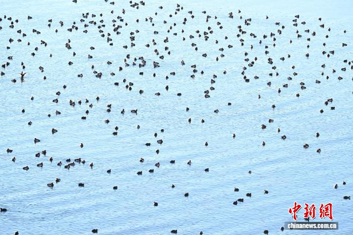 1月18日,成群的赤嘴潜鸭在沉错水域越冬。中新社记者 贡嘎来松 摄