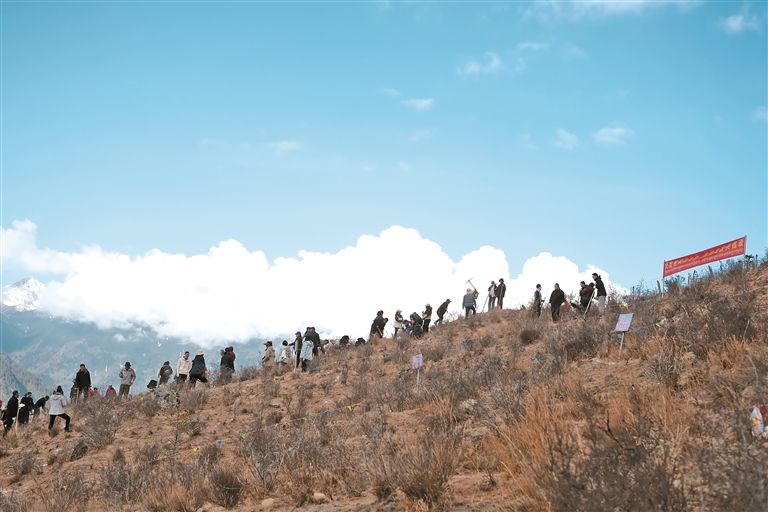 林芝市巴宜区区直各部门干部职工、消防指战员及群众在林芝镇嘎拉村生态修复项目区的山坡上,遍植1100余株光核桃树、杏梅树。记者 谢筱纯 摄