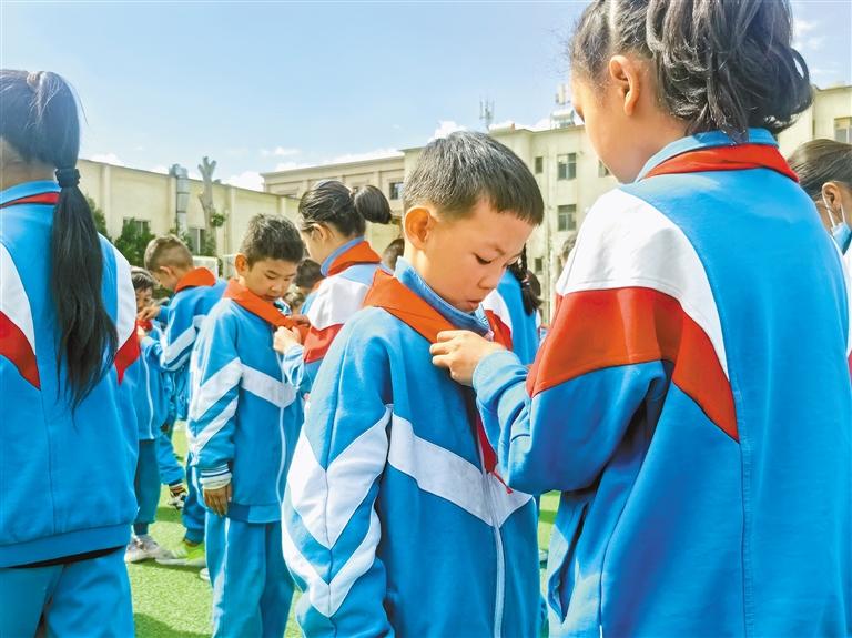 图为少先队员代表为新队员佩戴红领巾。记者 次仁平措 通讯员 胡舟 摄