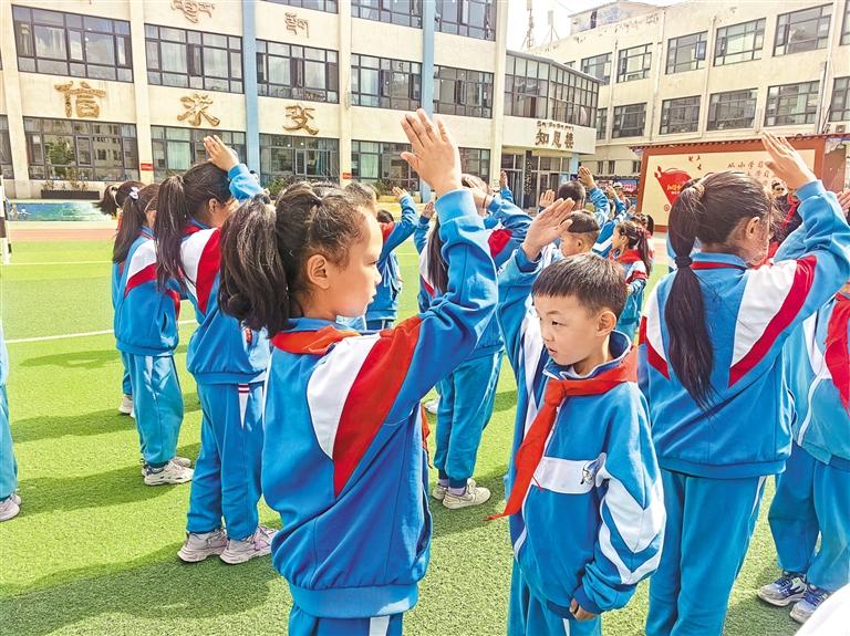图为新老少先队员行礼。