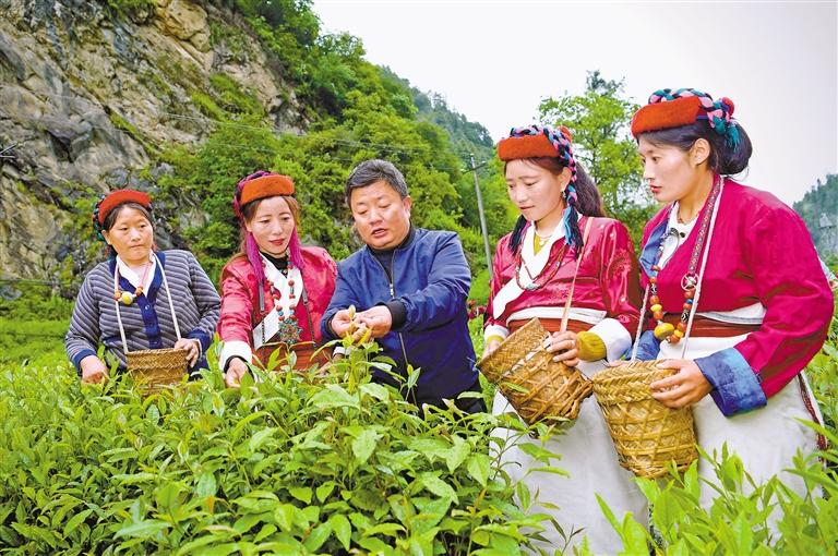 错那市勒布沟,安徽第七批援藏队队员裴含龙指导门巴族村民规范采摘茶叶。
