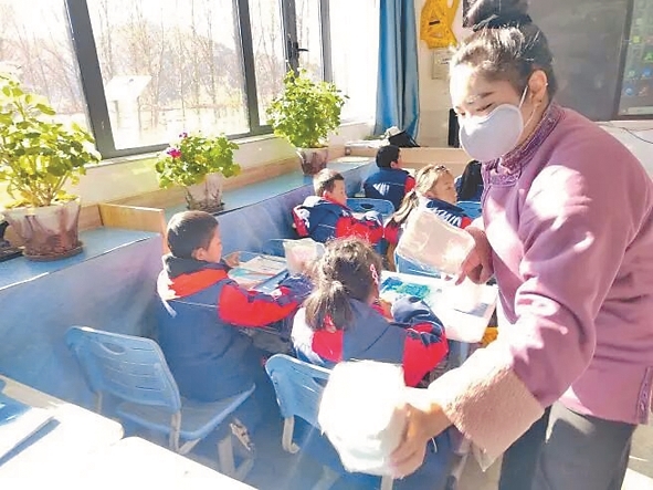 图为工作人员为学生发放宣传手册、学习用品等。记者 央金 摄