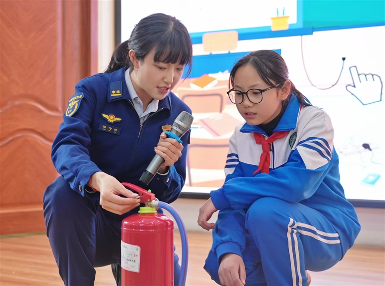 学校师生在消防员指导下体验灭火器扑灭初起火灾。肖暄 摄