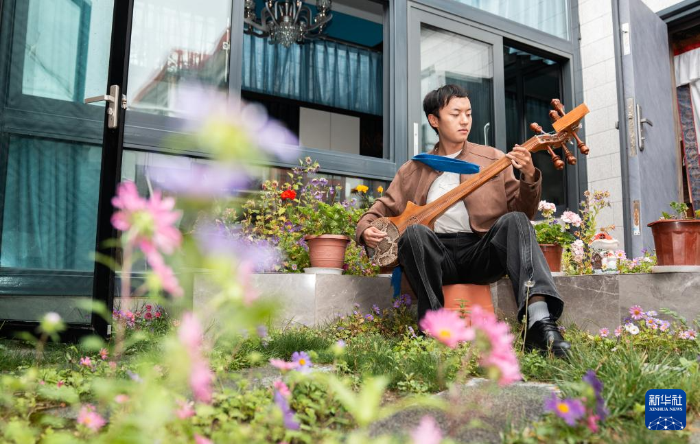 班珠丹塔在家中设计藏装间隙弹奏扎念琴(9月11日摄)。新华社记者 丁增尼达 摄
