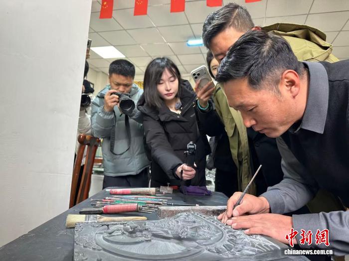 1月31日,中国国家级非遗砚台制作技艺(洮砚制作技艺)甘南州级代表性传承人卢苏努现场演示洮砚制作。中新社记者 冯志军 摄