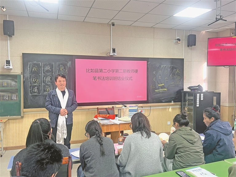 图为侯华胜为比如县第二小学第二期教师硬笔书法培训班结业寄语。