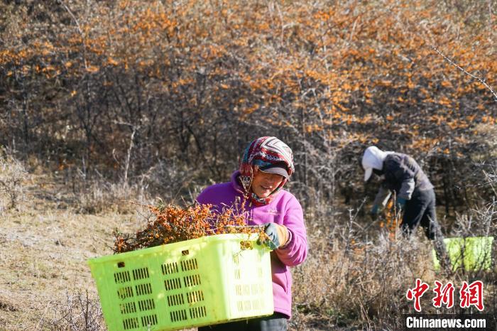 11月6日,在青海省西宁市湟源县一沙棘林中,村民将采摘的沙棘果装车。眼下,青海省西宁市湟源县人工种植的6.89万亩沙棘果迎来丰收。据悉,湟源县海拔高、无霜期短、温差大、日照时数长,小果沙棘成为当地重要的经济作物。目前,该县已形成基地建设、鲜果采摘、冷链储运、原料加工、拓宽销路的全产业链条,种植沙棘不仅有益于当地生态环保,更促进农户增收。中新社记者 马铭言 摄