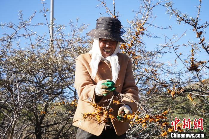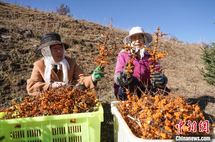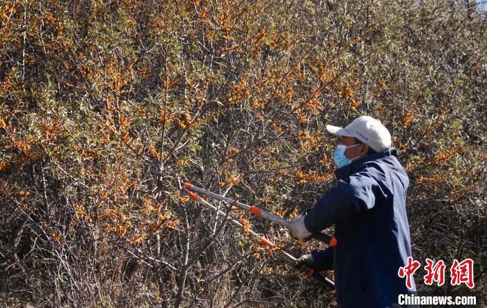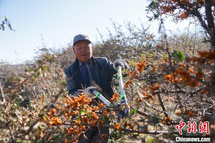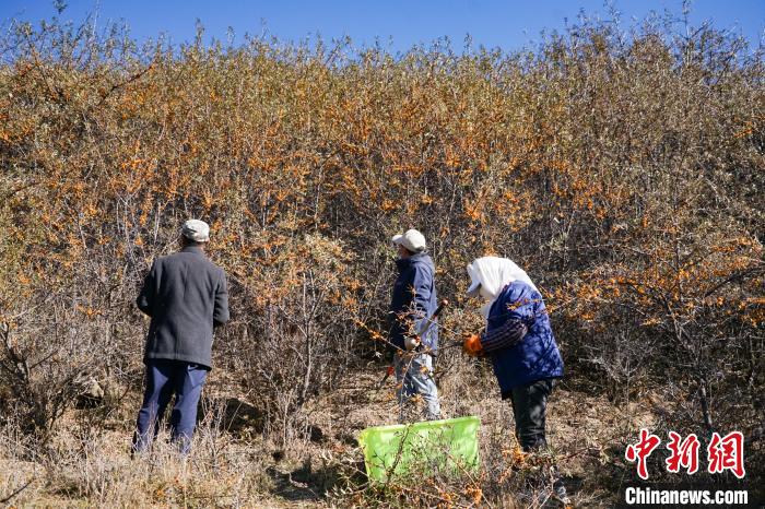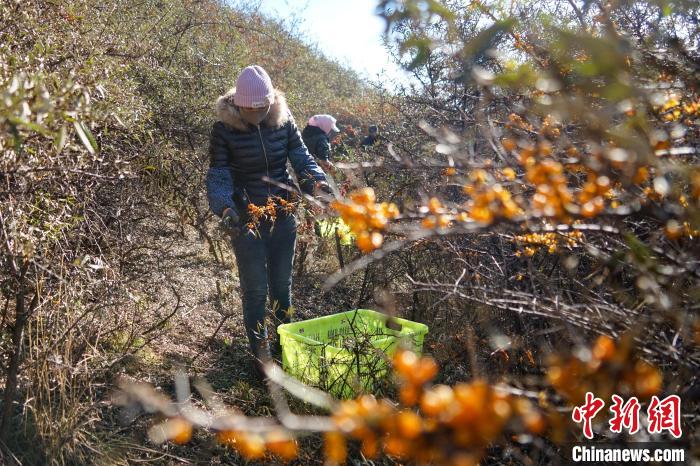 11月6日,在青海省西宁市湟源县一沙棘林中,村民采摘沙棘果。中新社记者 马铭言 摄