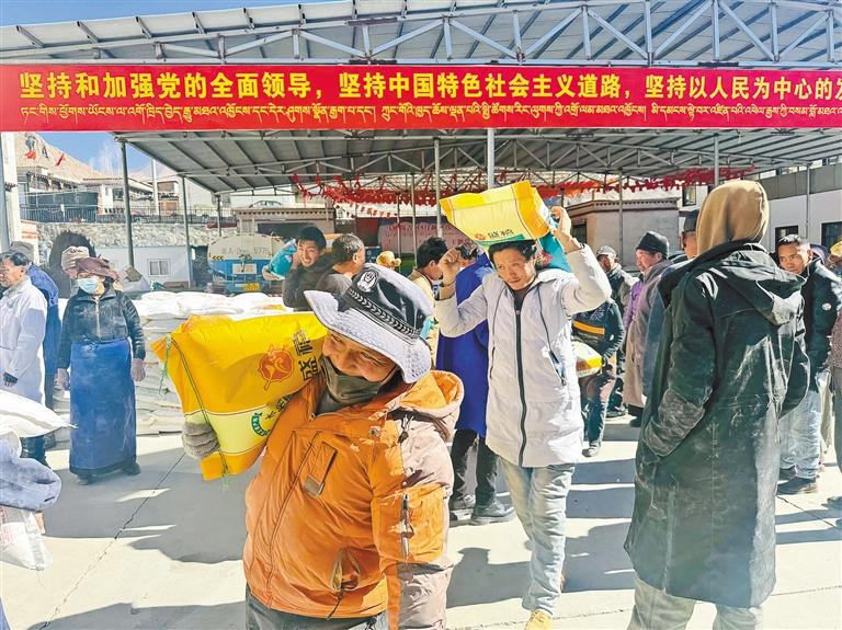 为了让广大群众切实感受到党和政府的关心关爱,享受到村集体经济发展的红利,近日,拉萨市堆龙德庆区马镇岗吉村举行2024年度村集体经济分红仪式。此次实物分红共计发放115箱奶粉、115箱卫生纸、115袋白糖、690袋大米及面粉,脱贫户再单独发放100元现金,总价值30.335万元。