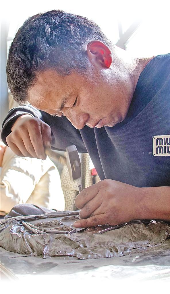 图为南木林县孜东金铜制佛古艺中心的手艺人在制作铜工艺品。