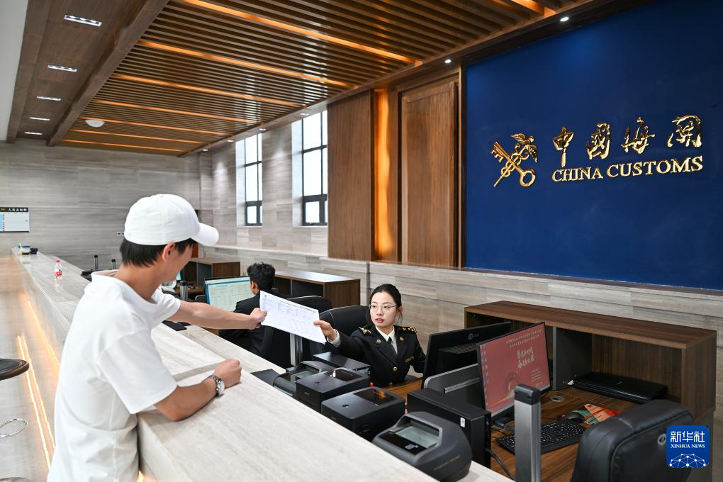 7月16日,日喀则国际陆地港出口货物查验场的海关关员为货车司机办理报关手续。新华社记者 李鑫 摄