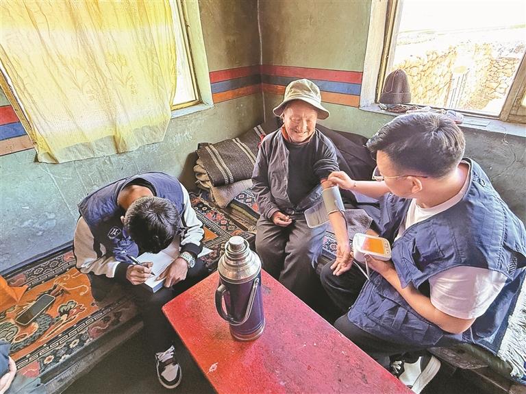 图为当雄县羊八井镇民政服务站工作人员入户为特供分散户老人做基础生命体征检查。图/文 记者 格桑伦珠