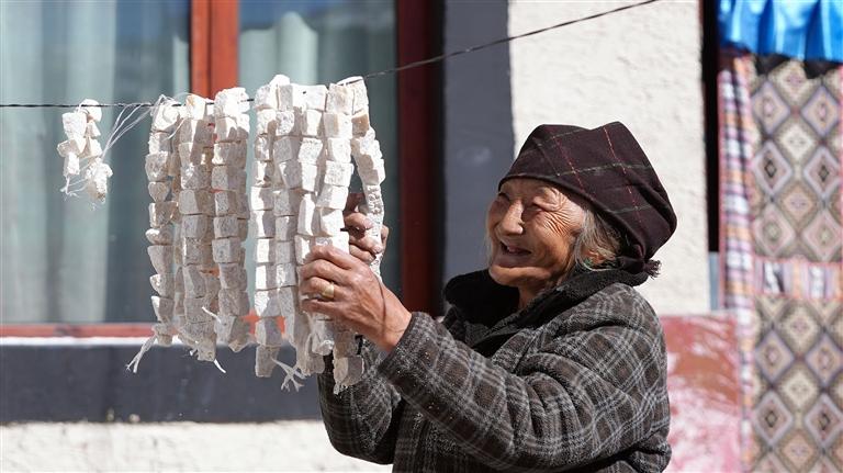 洛桑塔杰的老伴在晾晒奶渣。文/图 通讯员 次昂 记者 张雪芳