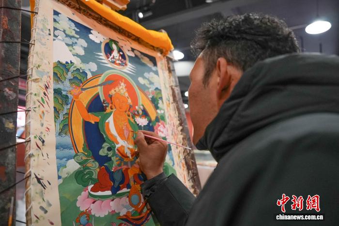 图为西藏乡村振兴产品展示中心内的唐卡绘制体验区。贡确 摄