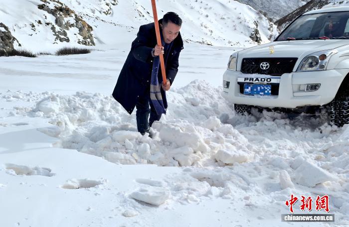 图为在下乡途中,扎西平措铲雪开路。巴青县雅安镇格夏贡村驻村 供图