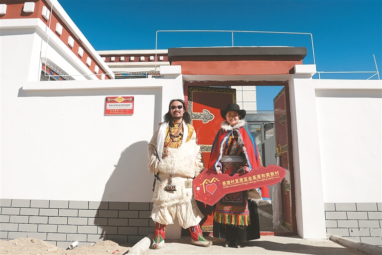 村民在自家新居门前合影。记者 永青 周辉 报道 图片由改则县融媒体中心提供