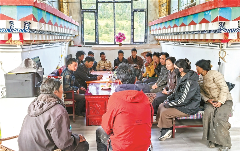 图为洛隆县马利镇布许村的“庭院议事屋”内,村干部与村民围坐商讨发展大计。记者 贡秋曲措 摄