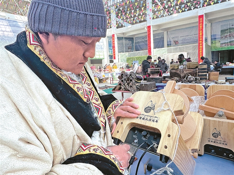 展销商正在展示自己的新发明“古老藏北纺线车”。记者 万靖 摄