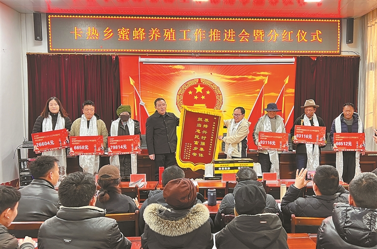 图为浪卡子县卡热乡举行养蜂产业收益分红仪式。