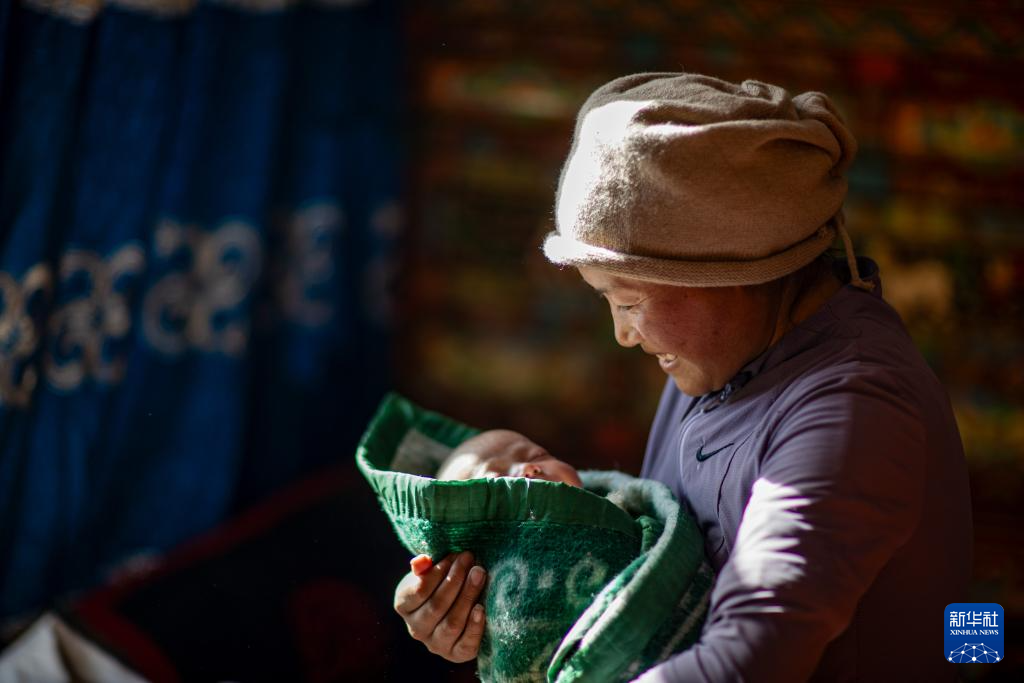 2025年1月8日,次仁拉姆抱着自己刚满月的孩子格桑巴宗。新华社记者 姜帆 摄