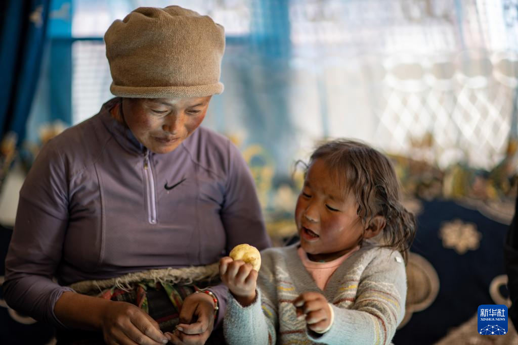 次仁拉姆(左)在新居中陪大女儿玩耍(1月5日摄)。新华社记者 姜帆 摄