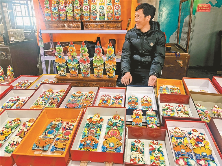 在拉萨八廓商城,“仁布亚德酥油花”的品牌标识格外醒目。师傅们精心制作的酥油花,经规范包装后运抵商城销售。新春前夕,商城内70多个酥油花摊位,经营者大多来自日喀则市仁布县,每年都会专程前来赶制售卖。临近正午,一排排酥油花整齐陈列,莲花、祥云、鲤鱼等传统造型栩栩如生、做工精致,吸引不少市民游客驻足选购。