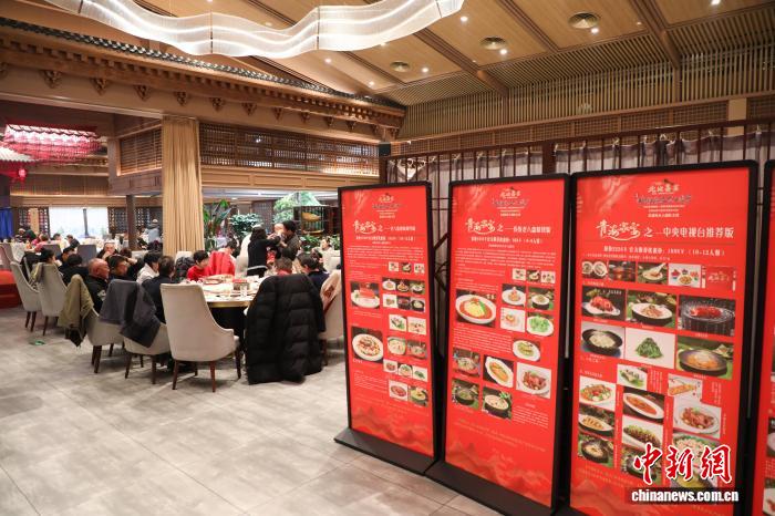 资料图为2月16日农历除夕,青海省西宁市某餐厅吃年夜饭的顾客和“青海家宴”菜品介绍展板。马铭言 摄