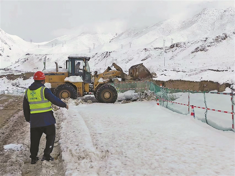 中交养护工程公司项目组启动应急响应,组织人员冒雪养护道路。记者 王莉 摄