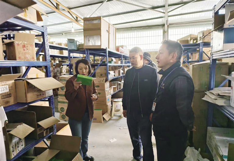 拉萨市市监局化妆品科执法人员正在开展检查。