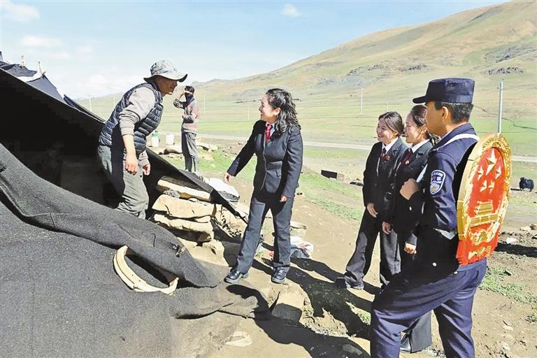 在广袤的草原深处,牧民群众的黑帐篷与成群的牛羊构成人与自然和谐共生的画卷。措美县人民法院干警来到放牧点,围坐于牧民群众间,用通俗易懂的语言打开话匣子。“大叔,您看这草场上的植被,要是过度放牧,来年就长不出这么好的草了,牛羊没了口粮,咱们的日子也受影响不是?”
