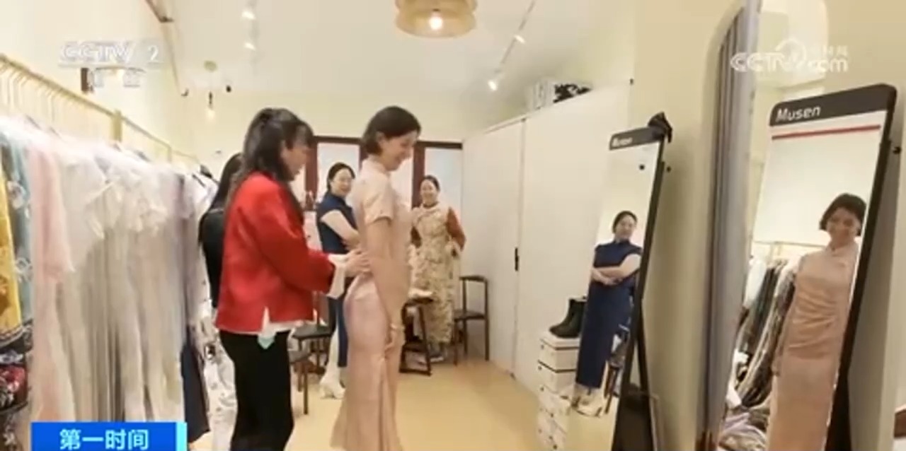上海田子坊某旗袍店店长 首仁欣:外国游客会给家里带中国特色的丝巾、刺绣,也会购买旗袍。因为外国人的入境消费,店铺的销量、营业额增长大概10%。