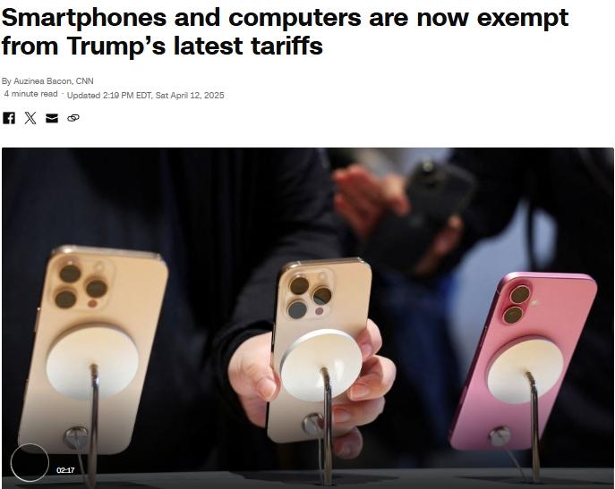 综合报道,当地时间11日晚,美国海关与边境保护局宣布,联邦政府已同意对智能手机、电脑、芯片等电子产品免除所谓“对等关税”。