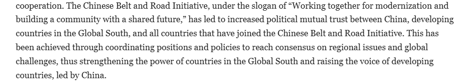 文章注意到,中国不仅提出与全球南方国家构建人类命运共同体的新理念和新倡议,还宣布了与全球南方国家开展务实合作的新措施,涉及国家治理、工业化与农业现代化、和平与安全,以及共建“一带一路”框架下的高质量合作等新议题,以实现互利共赢。