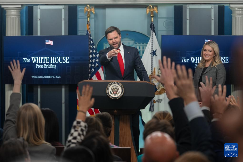 10月1日,在美国首都华盛顿白宫,美国副总统万斯(左)请记者提问。新华社记者胡友松摄