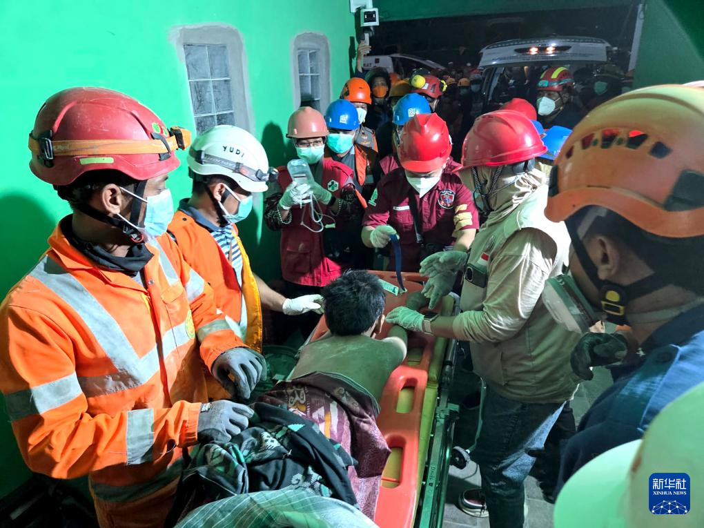 10月1日,救援人员在印度尼西亚东爪哇省诗都阿佐县建筑倒塌现场救出一名幸存者。新华社发(印尼国家搜救局供图)