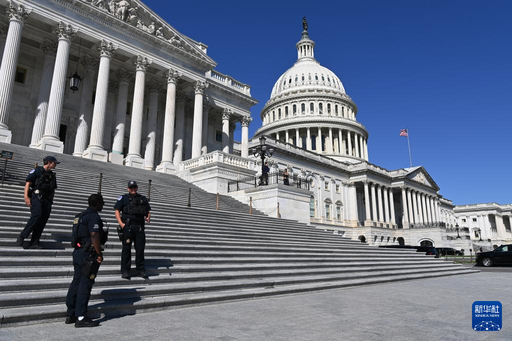 10月1日,在美国首都华盛顿,警察在美国国会大厦前警戒。新华社记者 李睿 摄