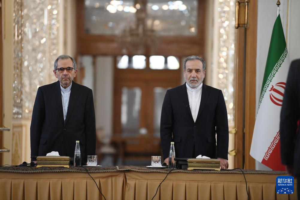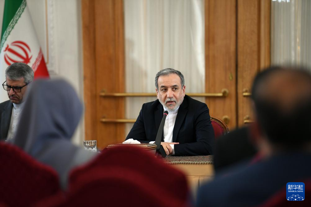 10月5日,在伊朗首都德黑兰,伊朗外交部长阿拉格齐(右)对多国驻伊朗外交人员发表讲话。新华社记者 沙达提 摄