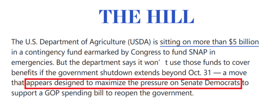 对此,美国《国会山报》直言,农业部种种说辞显然为了最大限度地向参议院民主党人施压,迫使他们支持共和党的支出法案,以重启政府。