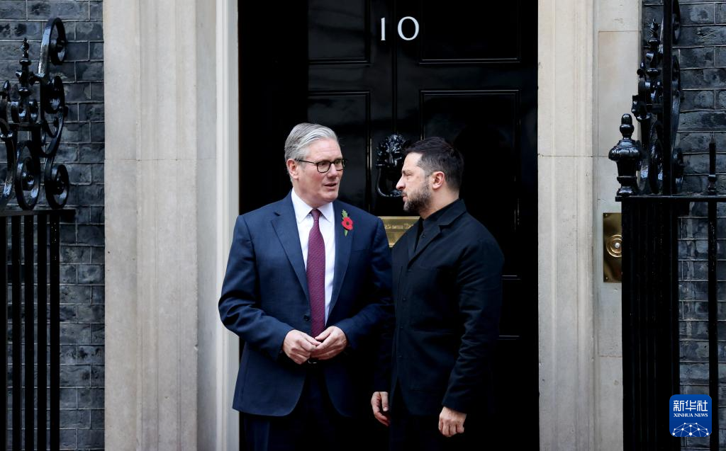 10月24日,在英国伦敦唐宁街10号首相府前,英国首相斯塔默(左)与到访的乌克兰总统泽连斯基交谈。新华社记者 李颖 摄