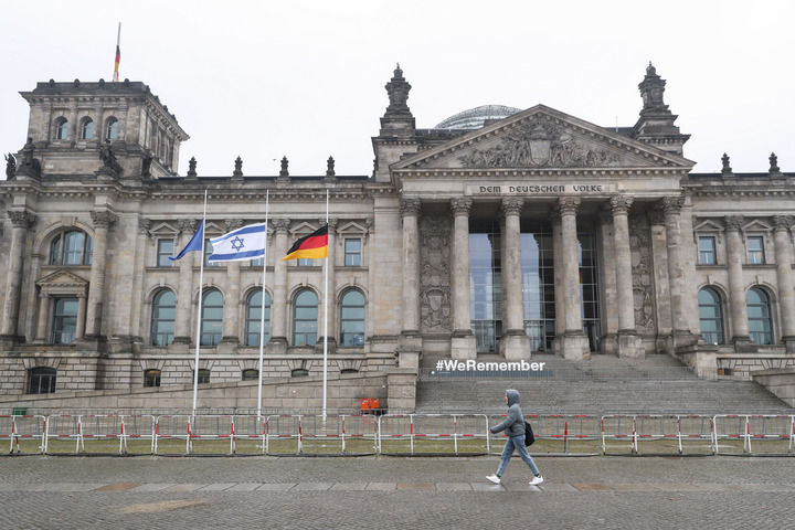 2022年1月27日,德国联邦议会举行纳粹大屠杀受害者纪念活动。在国会大厦前,德国、以色列和欧盟旗帜降半旗。(单宇琦 摄)