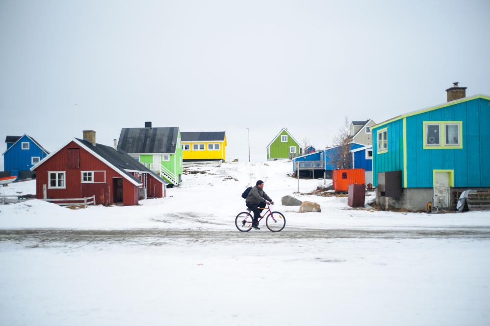 3月22日,在丹麦自治领地格陵兰岛纳尔萨克,一名男子在街道上骑行。新华社记者彭子洋摄