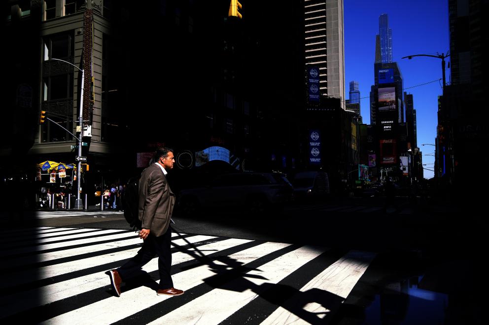 10月1日,在美国纽约曼哈顿的时报广场附近,行人通过人行横道斑马线过马路。新华社记者吴晓凌摄