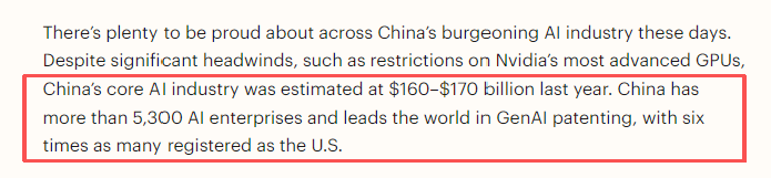 《时代》周刊的文章以中国人工智能实体企业从业人员的经历为切入口,称自豪感正蔓延至中国蓬勃发展的AI产业。2025年中国核心AI产业规模达1600-1700亿美元。数据显示,中国拥有5300余家AI企业,其生成式AI专利数量是美国的6倍。